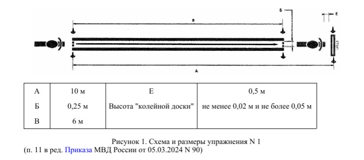 При выполнении упражнения № 1 «Проезд по «колейной доске» у кандидата в водители проверяются навыки управления мототранспортным средством путем выполнения маневра, предусмотренного подпунктом «б» пункта 13 Правил проведения экзаменов на право управления транспортными средствами и выдачи водительских удостоверений, утвержденных постановлением Правительства Российской Федерации от 24 октября 2014 г.